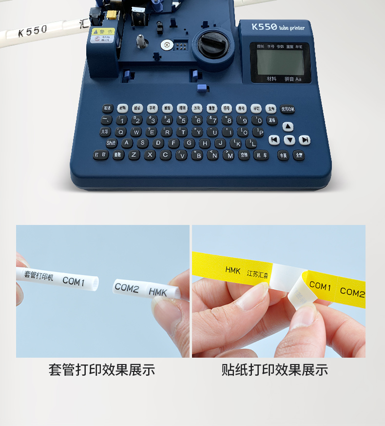 HMK匯淼套管標簽打印機K550/K900跟普通的標簽打印機不一樣,它可以在套管和熱縮管上直接打字,又可以打印在PET不干膠貼紙(標簽)上,一般用于電控、配電設備二次線標識,是電控、配電設備及綜合布線工程配線標識的專用設備,可滿足電廠、電氣設備廠、變電站、電力行業(yè)電線區(qū)分標志標識的需要。